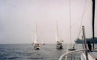 Champlain Rendezvous 2002 Leader's Report by Gerold Noyes This year's rendezvous had a record number of boats (17), family (4 boats with children and 3 with dogs), and heat! There was also good sailing, but a number of days were cut short as people decided to motor to the next anchorage and go swimming instead of sailing slowly and broiling in the sun.